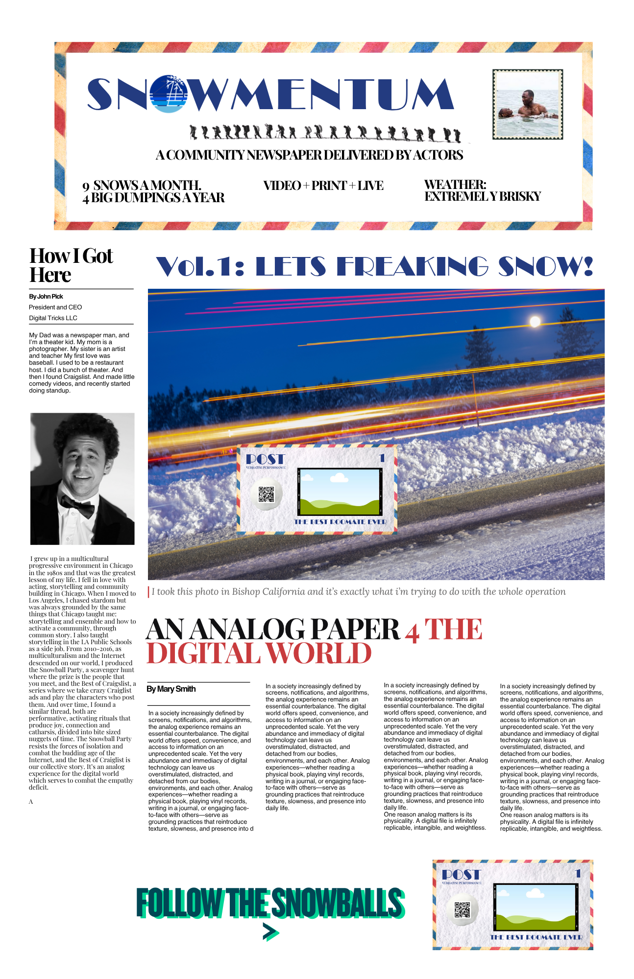 Dec 31 #ALPHABET Wednesday, December 31, 2025 7:00 PM 8:00 PM South Pasadena (map) Google Calendar ICS View Event → Oct 31 #HOUSEGUEST Friday, October 31, 2025 7:00 PM 8:00 PM Pasadena, California (map) Google Calendar ICS Join Text Messaging List Select a list alphabet boomerang chameleon disco firefly galaxy houseguest inkblot jamboree Contact first name Contact last name Contact email Phone Terms and conditions I agree to receive promotional messages from Digital Tricks LLC up to 4 Msgs/Month. This agreement isn't a condition of any purchase. I also agree to the Terms of Service and Privacy Policy. Msg & Data rates may apply. By submitting this form, I agree that my mobile information will not be shared with third parties/affiliates for marketing/promotional purposes. All the above categories exclude my text messaging originator opt-in data and consent; this information will not be shared with any third parties, except for the necessary opt-in data required to facilitate the SMS service. Text STOP to opt-out. Text HELP for assistance. johnpick1@gmail.com. You have to agree on terms in order to proceed to the subscription. Subscribe now Thank you for signing up! You will receive messages from Snowmentum. View Event → Oct 30 #INKBLOT Thursday, October 30, 2025 7:00 PM 8:00 PM Pasadena, California (map) Google Calendar ICS Join Text Messaging List Select a list alphabet boomerang chameleon disco Echo firefly galaxy houseguest inkblot Contact first name Contact last name Contact email Phone Terms and conditions I agree to receive promotional messages from Digital Tricks LLC up to 4 Msgs/Month. This agreement isn't a condition of any purchase. I also agree to the Terms of Service and Privacy Policy. Msg & Data rates may apply. By submitting this form, I agree that my mobile information will not be shared with third parties/affiliates for marketing/promotional purposes. All the above categories exclude my text messaging originator opt-in data and consent; this information will not be shared with any third parties, except for the necessary opt-in data required to facilitate the SMS service. Text STOP to opt-out. Text HELP for assistance. johnpick1@gmail.com. You have to agree on terms in order to proceed to the subscription. Subscribe now Thank you for signing up! You will receive messages from Snowmentum. View Event → Oct 29 #HOUSEGUEST Wednesday, October 29, 2025 7:00 PM 8:00 PM Pasadena, California (map) Google Calendar ICS Join Text Messaging List Select a list alphabet boomerang chameleon disco Echo firefly galaxy houseguest inkblot Contact first name Contact last name Contact email Phone Terms and conditions I agree to receive promotional messages from Digital Tricks LLC up to 4 Msgs/Month. This agreement isn't a condition of any purchase. I also agree to the Terms of Service and Privacy Policy. Msg & Data rates may apply. By submitting this form, I agree that my mobile information will not be shared with third parties/affiliates for marketing/promotional purposes. All the above categories exclude my text messaging originator opt-in data and consent; this information will not be shared with any third parties, except for the necessary opt-in data required to facilitate the SMS service. Text STOP to opt-out. Text HELP for assistance. johnpick1@gmail.com. You have to agree on terms in order to proceed to the subscription. Subscribe now Thank you for signing up! You will receive messages from Snowmentum. View Event → Oct 27 #ECHO Monday, October 27, 2025 7:00 PM 8:00 PM Pasadena, California (map) Google Calendar ICS Join Text Messaging List Select a list alphabet boomerang chameleon disco Echo firefly galaxy houseguest inkblot Contact first name Contact last name Contact email Phone Terms and conditions I agree to receive promotional messages from Digital Tricks LLC up to 4 Msgs/Month. This agreement isn't a condition of any purchase. I also agree to the Terms of Service and Privacy Policy. Msg & Data rates may apply. By submitting this form, I agree that my mobile information will not be shared with third parties/affiliates for marketing/promotional purposes. All the above categories exclude my text messaging originator opt-in data and consent; this information will not be shared with any third parties, except for the necessary opt-in data required to facilitate the SMS service. Text STOP to opt-out. Text HELP for assistance. johnpick1@gmail.com. You have to agree on terms in order to proceed to the subscription. Subscribe now Thank you for signing up! You will receive messages from Snowmentum. View Event → Oct 24 #FIREFLY Friday, October 24, 2025 7:00 PM 8:00 PM Pasadena, California (map) Google Calendar ICS Join Text Messaging List Select a list alphabet boomerang chameleon disco Echo firefly galaxy houseguest inkblot Contact first name Contact last name Contact email Phone Terms and conditions I agree to receive promotional messages from Digital Tricks LLC up to 4 Msgs/Month. This agreement isn't a condition of any purchase. I also agree to the Terms of Service and Privacy Policy. Msg & Data rates may apply. By submitting this form, I agree that my mobile information will not be shared with third parties/affiliates for marketing/promotional purposes. All the above categories exclude my text messaging originator opt-in data and consent; this information will not be shared with any third parties, except for the necessary opt-in data required to facilitate the SMS service. Text STOP to opt-out. Text HELP for assistance. johnpick1@gmail.com. You have to agree on terms in order to proceed to the subscription. Subscribe now Thank you for signing up! You will receive messages from Snowmentum. View Event → Oct 18 #INKBLOT Saturday, October 18, 2025 7:00 PM 8:00 PM Pasadena, California (map) Google Calendar ICS Join Text Messaging List Select a list alphabet boomerang chameleon disco Echo firefly galaxy houseguest inkblot Contact first name Contact last name Contact email Phone Term